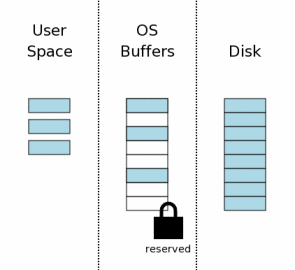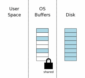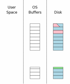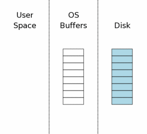 The state of the computer when a database connection is first opened is shown conceptually by the diagram at the right. The area of the diagram on the extreme right (labeled "Disk") represents information stored on the mass storage device. Each rectangle is a sector. The blue color represents that the sectors contain original data. The middle area is the operating systems disk cache. At the onset of our example, the cache is cold and this is represented by leaving the rectangles of the disk cache empty. The left area of the diagram shows the content of memory for the process that is using SQLite. The database connection has just been opened and no information has been read yet, so the user space is empty.