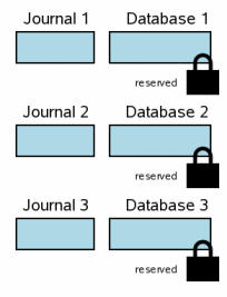 When multiple database files are involved in a transaction, each database has its own rollback journal and each database is locked separately. The diagram at the right shows a scenario where three different database files have been modified within one transaction. The situation at this step is analogous to the single-file transaction scenario at step 3.6. Each database file has a reserved lock. For each database, the original content of pages that are being changed have been written into the rollback journal for that database, but the content of the journals have not yet been flushed to disk. No changes have been made to the database file itself yet, though presumably there are changes being held in user memory.