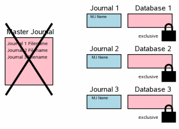 If a power failure or operating system crash occurs at this point, the transaction will not rollback when the system reboots even though there are rollback journals present. The difference is the super-journal pathname in the header of the rollback journal. Upon restart, SQLite only considers a journal to be hot and will only playback the journal if there is no super-journal filename in the header (which is the case for a single-file commit) or if the super-journal file still exists on disk.