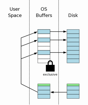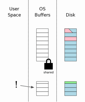 When a new file is created, most desktop operating systems (Windows, Linux, Mac OS X) will not actually write anything to disk. The new file is created in the operating systems disk cache only. The file is not created on mass storage until sometime later, when the operating system has a spare moment. This creates the impression to users that I/O is happening much faster than is possible when doing real disk I/O. We illustrate this idea in the diagram to the right by showing that the new rollback journal appears in the operating system disk cache only and not on the disk itself.