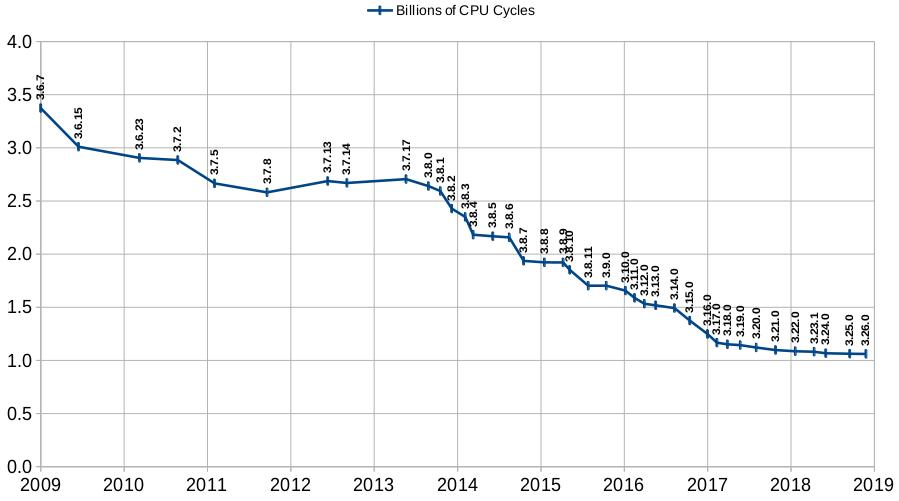 The graph below shows the number of CPU cycles used by SQLite on a standard workload, for versions of SQLite going back about 10 years. Recent versions of SQLite use about one third as many CPU cycles compared to older versions.